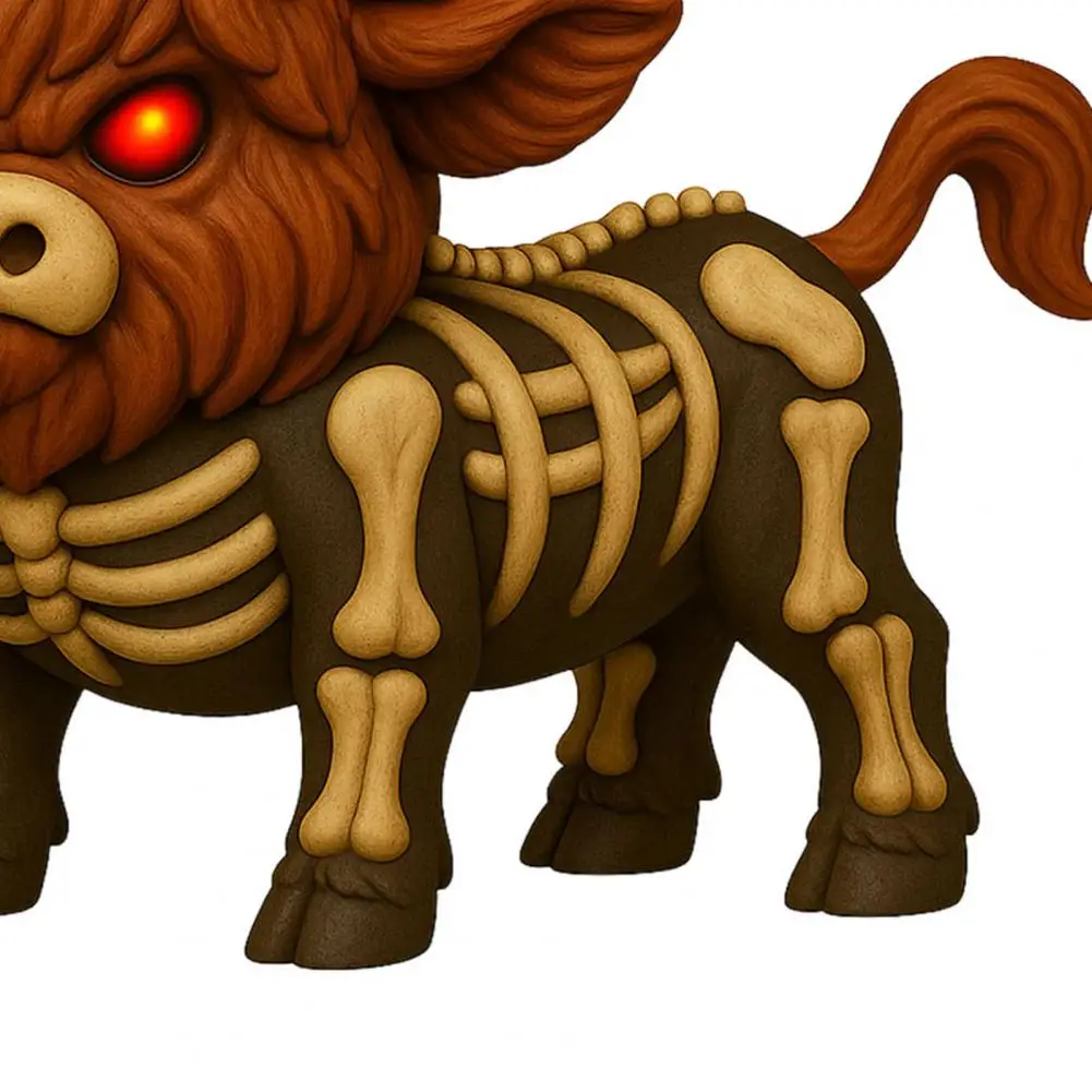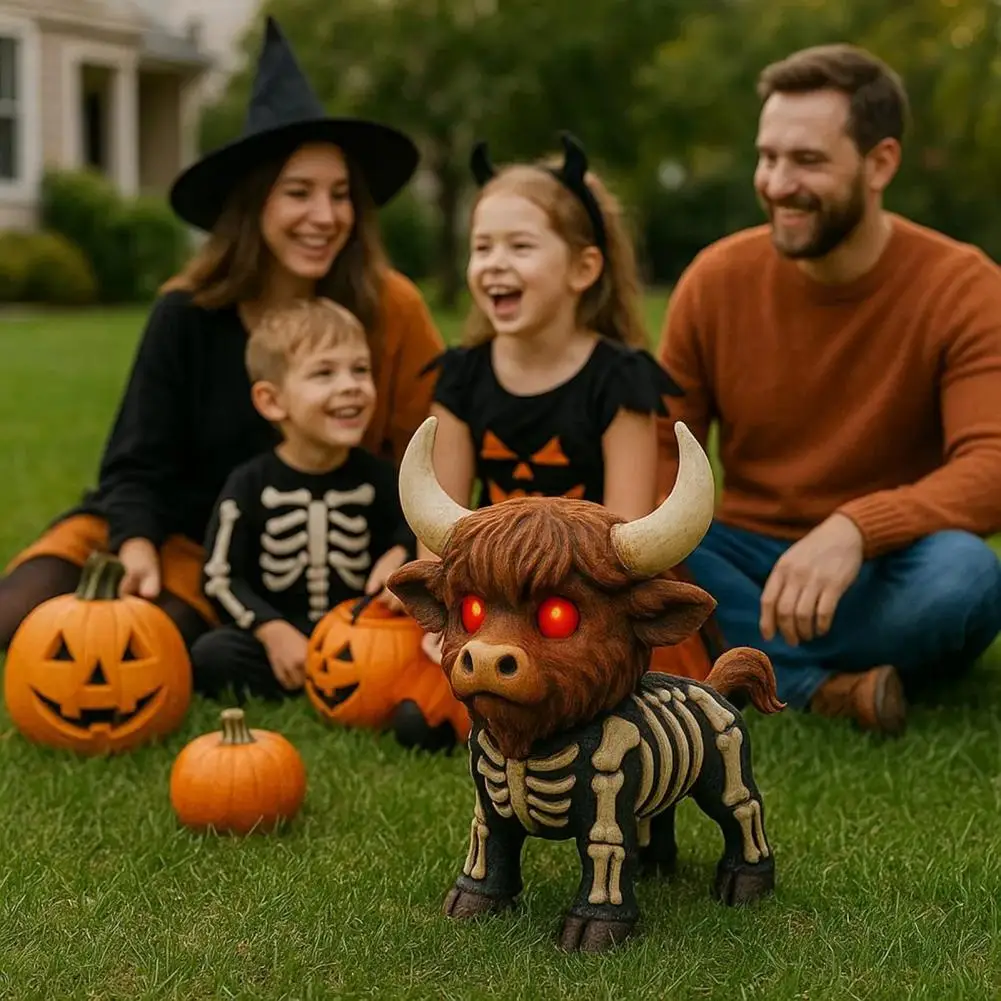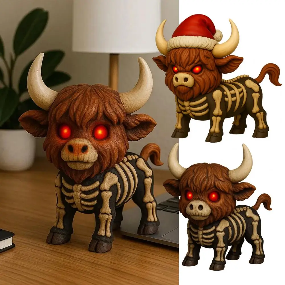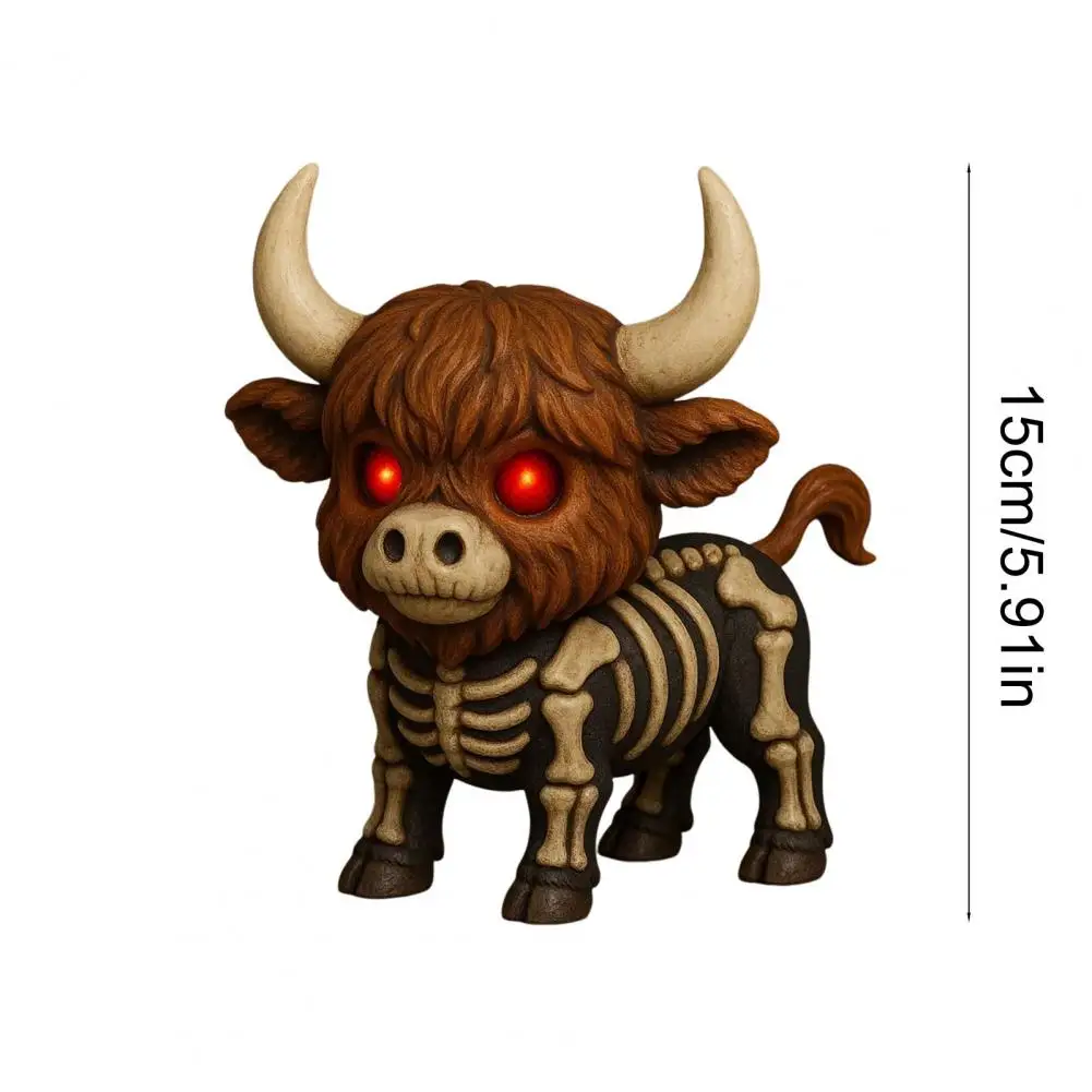Thrilling and Cute: Handmade resin highland cow figurine with red eyes, delicate skeleton torso, and iconic highland fluffy hair. A perfect blend of thriller and cuteness that captivates both children and parents alike.