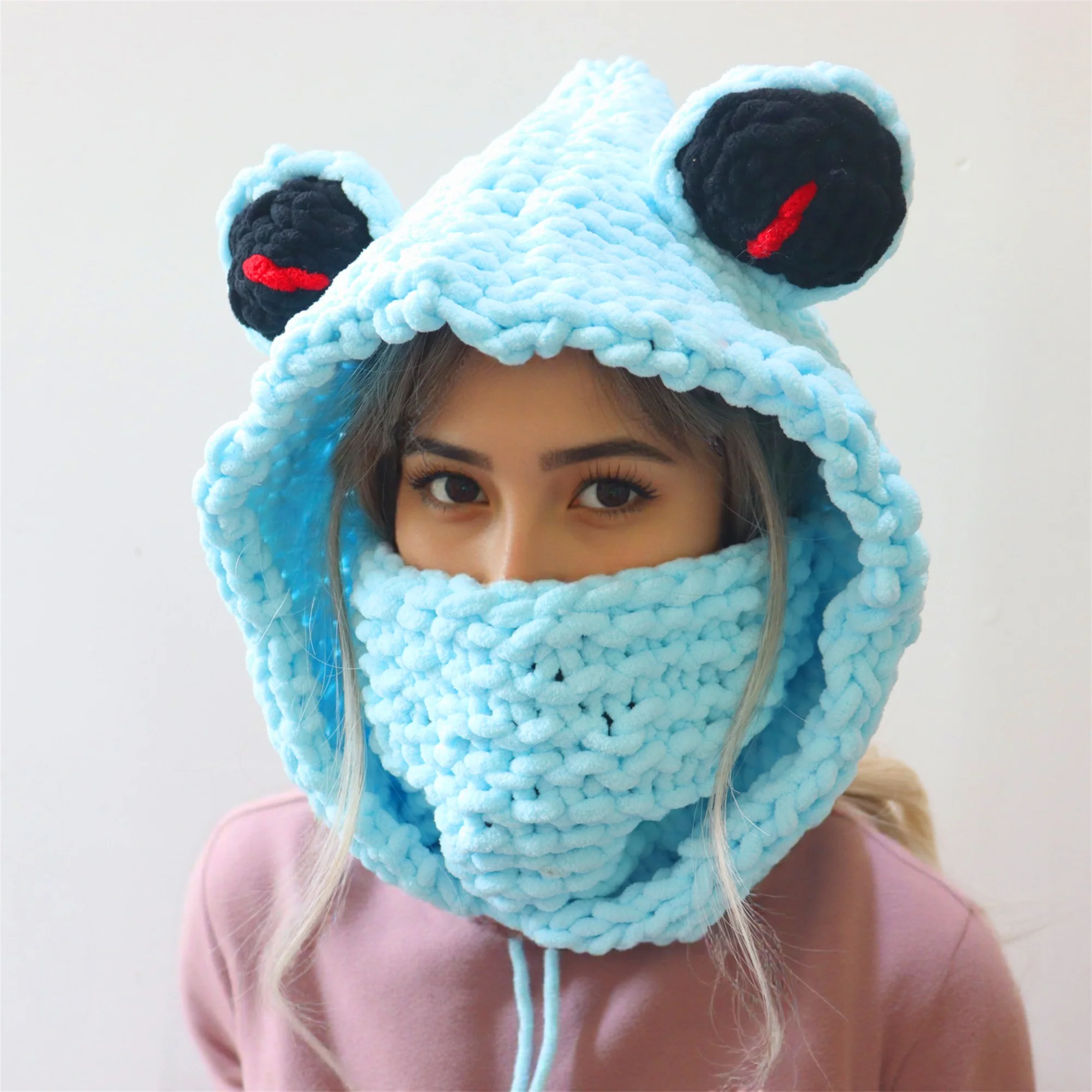 Women Hat Scarf Combo, Cute Frog Soft Warm Knit Balaclava Winter Neck Warmer Fashion Accessories