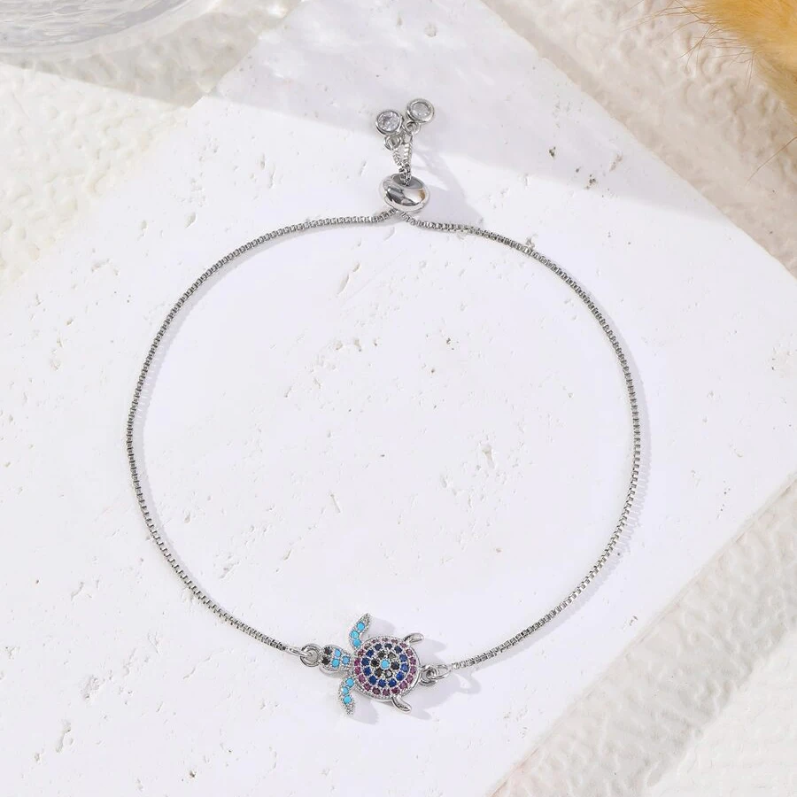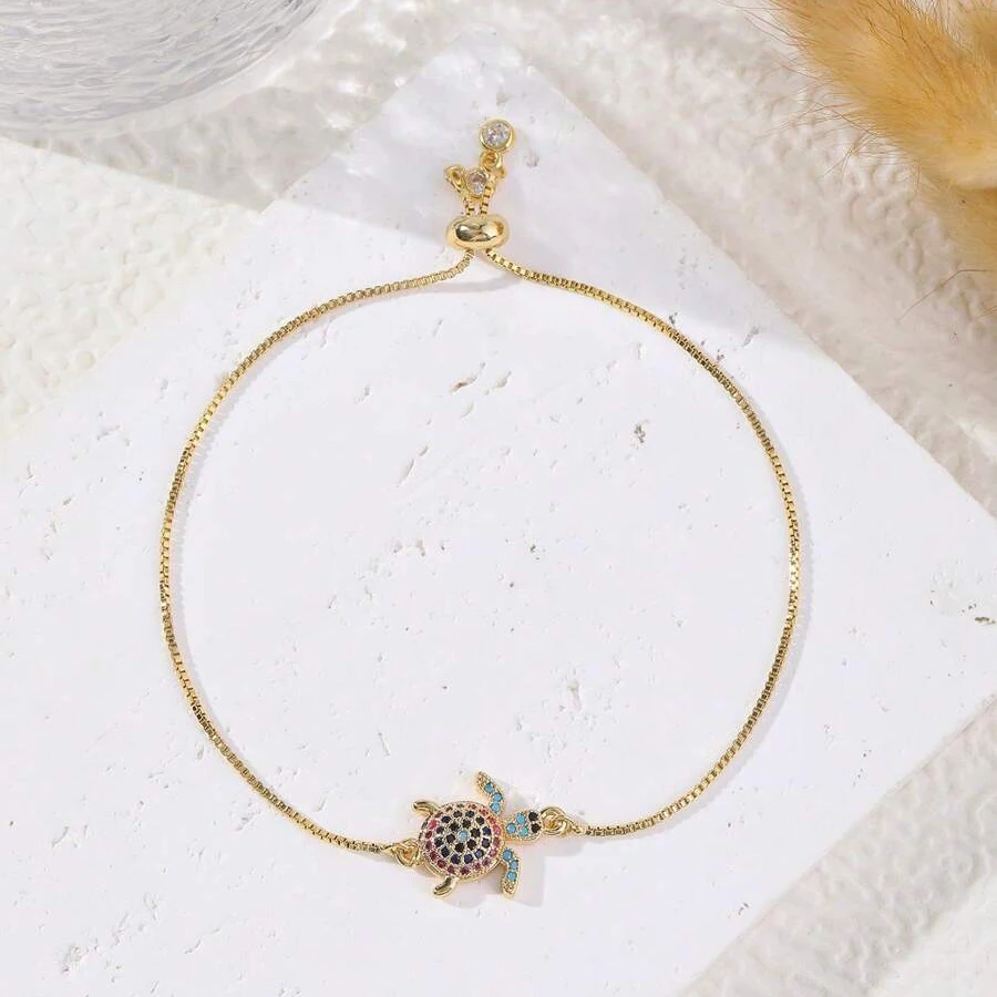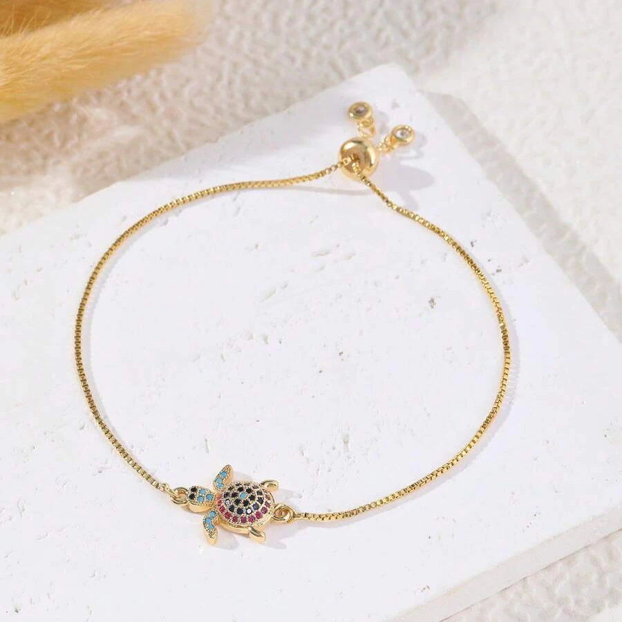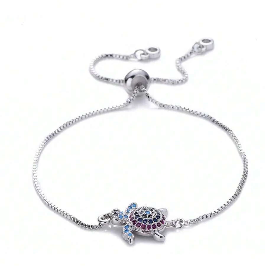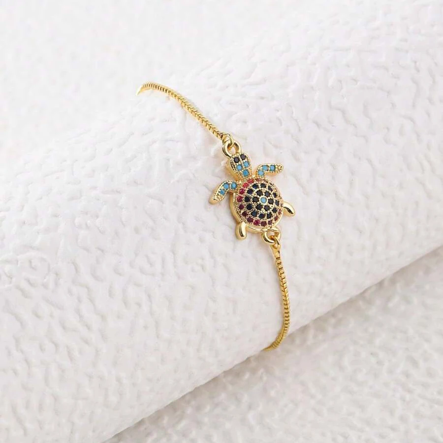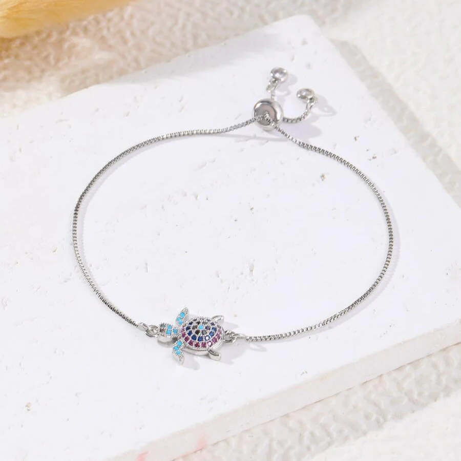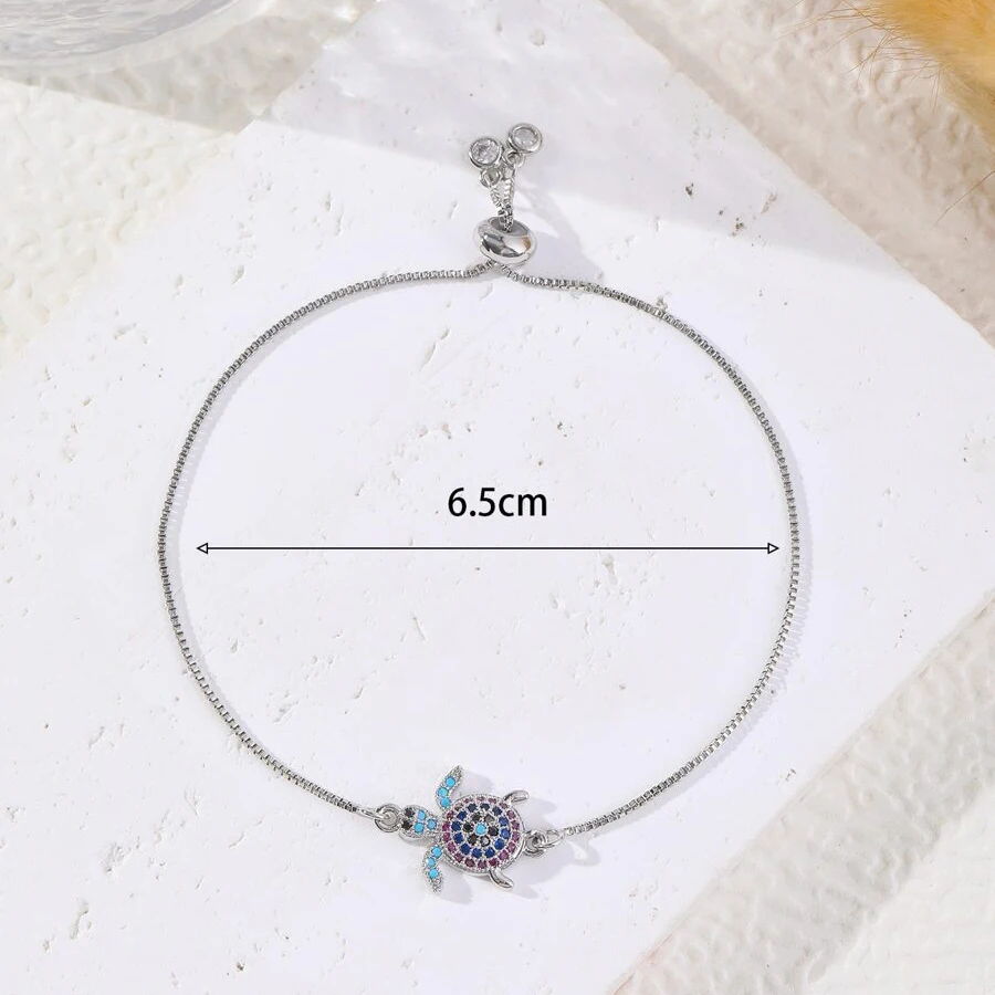 NAME:Multicolor Rainbow Cubic Zirconia Crystal Turtle Charm Bracelet Women New Trendy Sea Tortoise Copper Chain Adjustable Jewelry