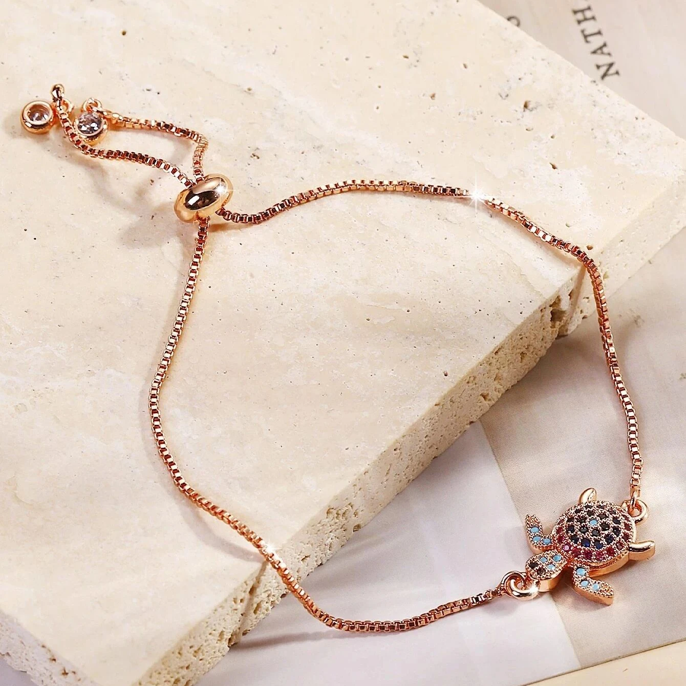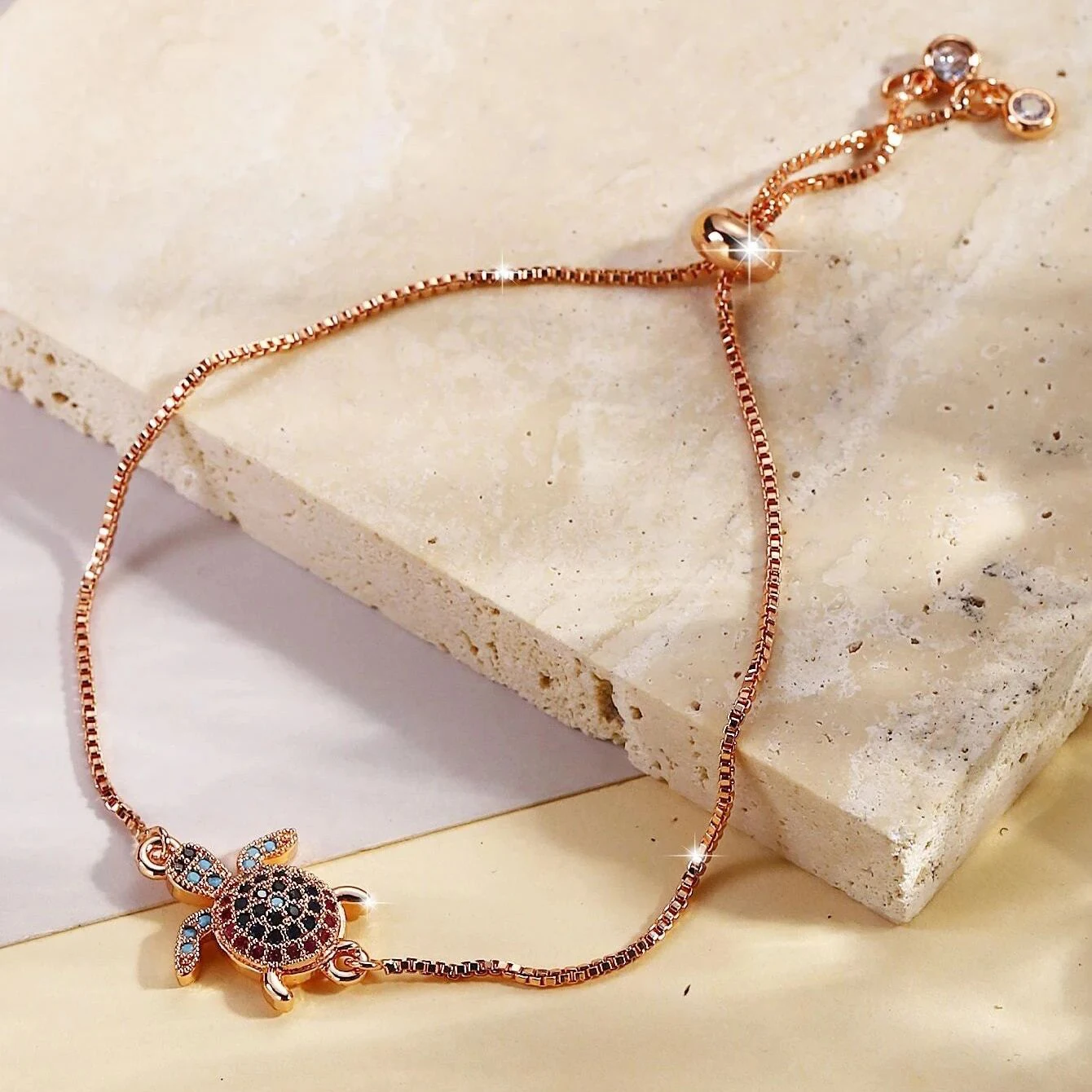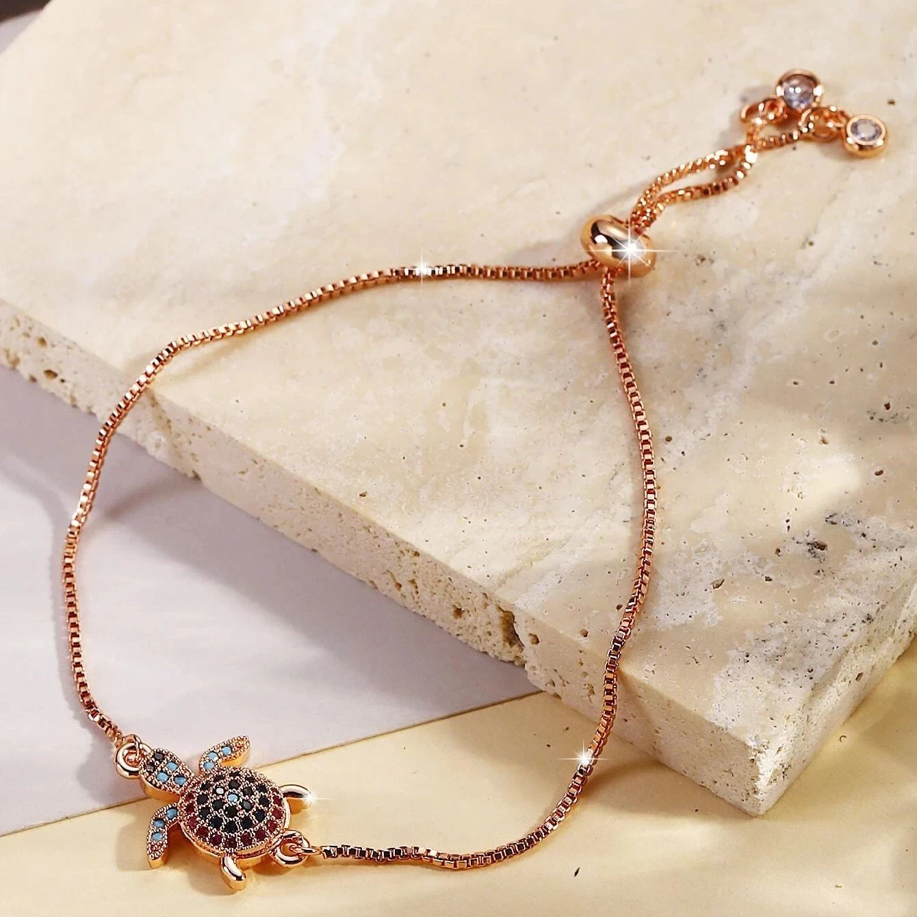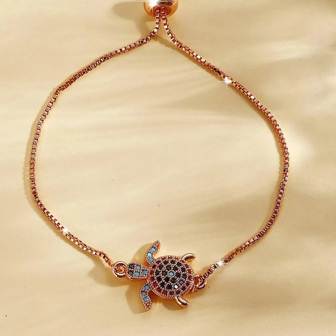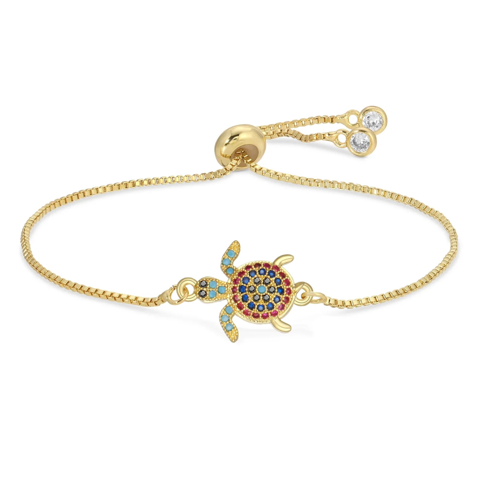 NAME:Multicolor Rainbow Cubic Zirconia Crystal Turtle Charm Bracelet Women New Trendy Sea Tortoise Copper Chain Adjustable Jewelry